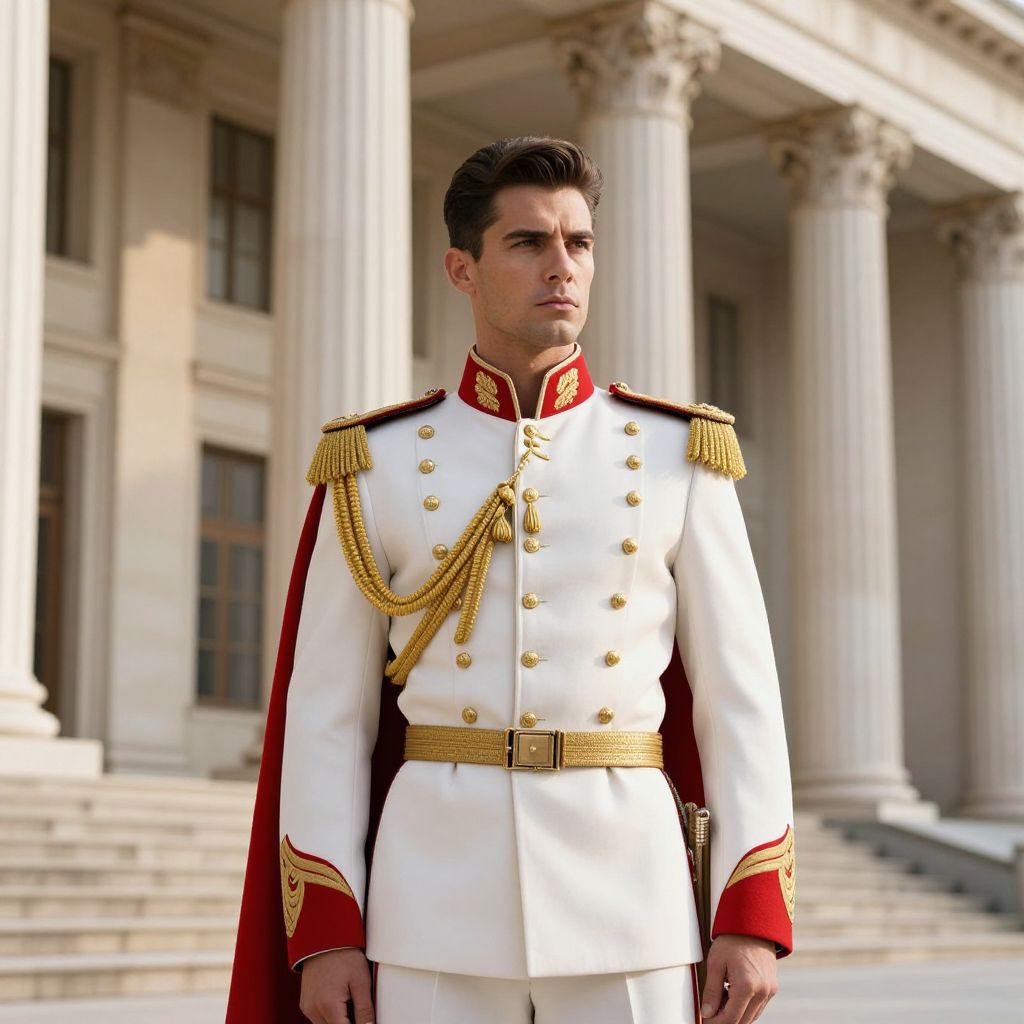 A photo of a handsome man standing confidently in front of a grand, classical building with tall columns. He's wearing a white military-style uniform with red and gold accents, including a red cape and a golden belt. His dark hair is neatly styled, and he has a serious expression. The sunlight casts a warm glow on the scene, highlighting the intricate details of his uniform and the architectural background.