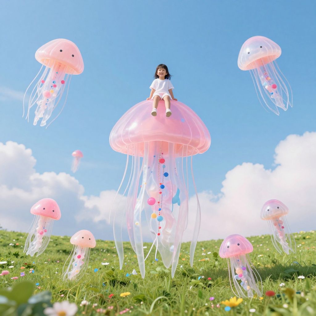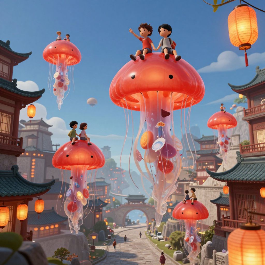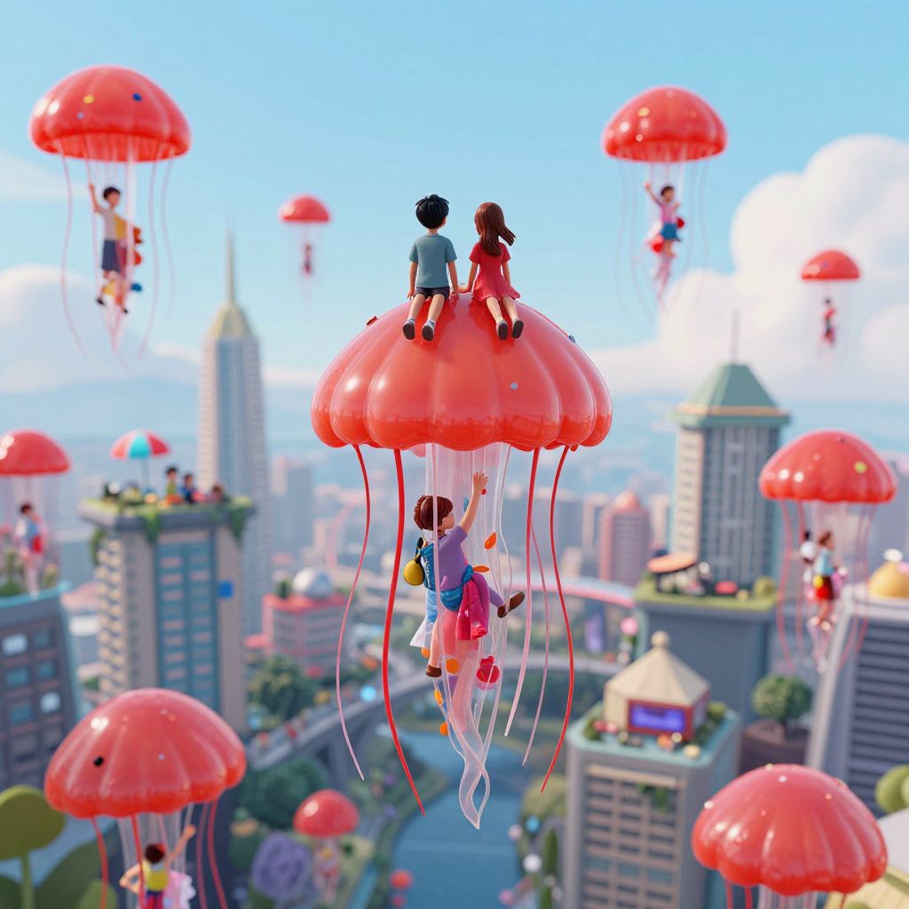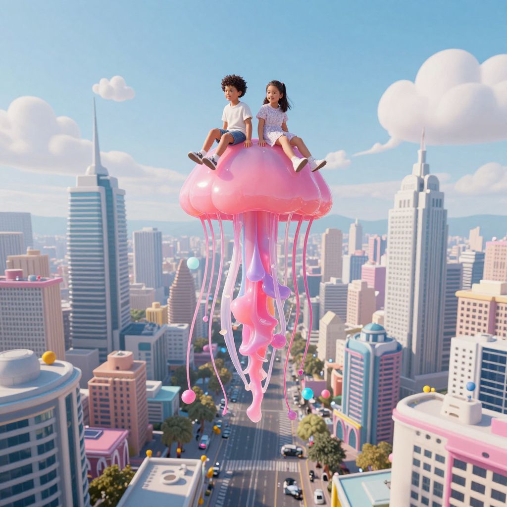 Children perch atop a vibrant pink jellyfish, defying gravity as they float serenely above a tranquil city street, its mirrored water reflecting the whimsical scene.