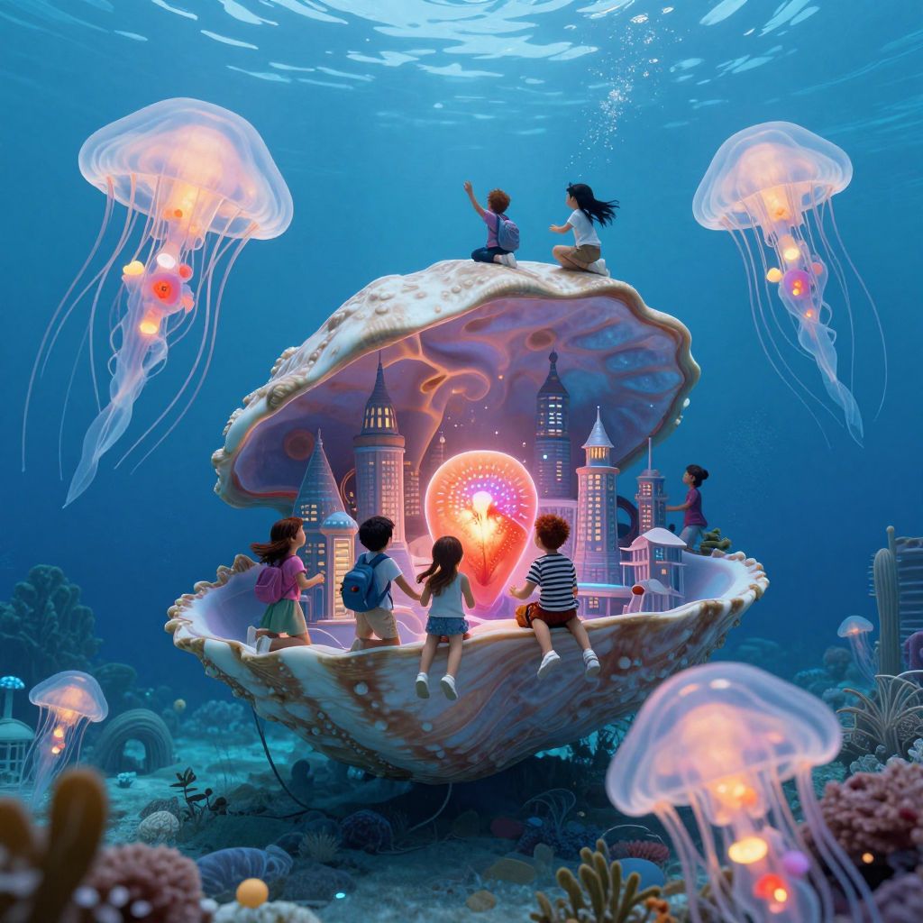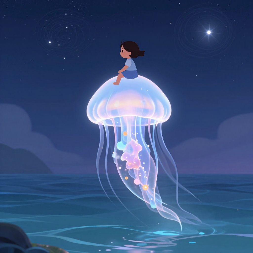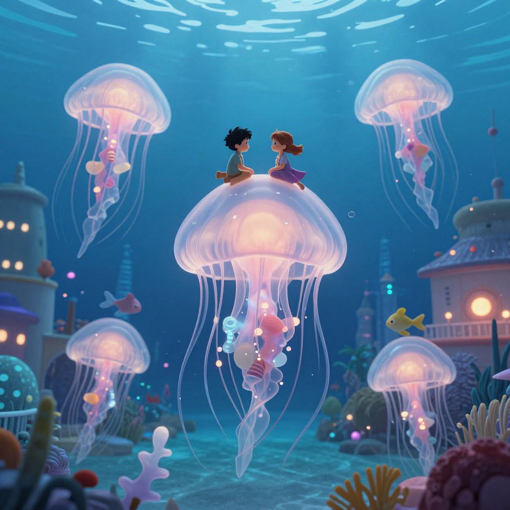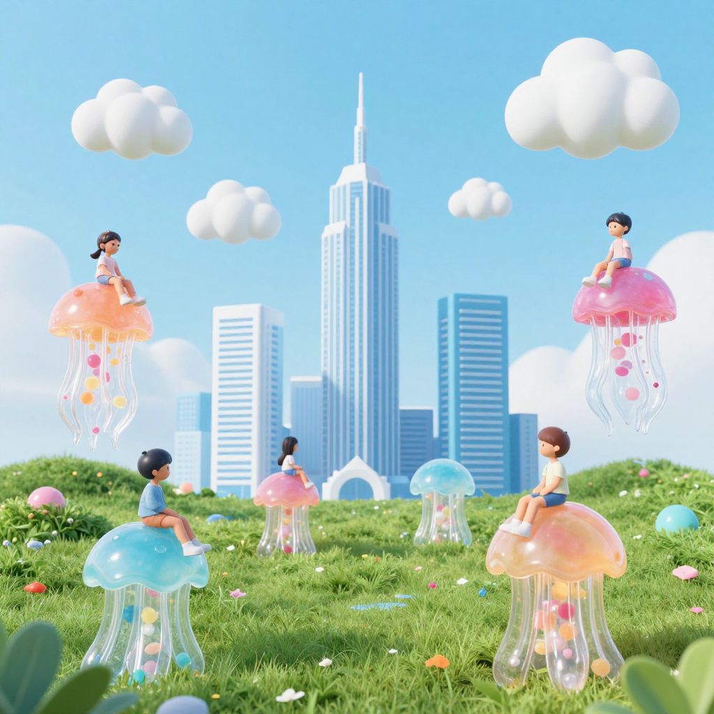 Children perch atop a vibrant pink jellyfish, defying gravity as they float serenely above a tranquil city street, its mirrored water reflecting the whimsical scene.