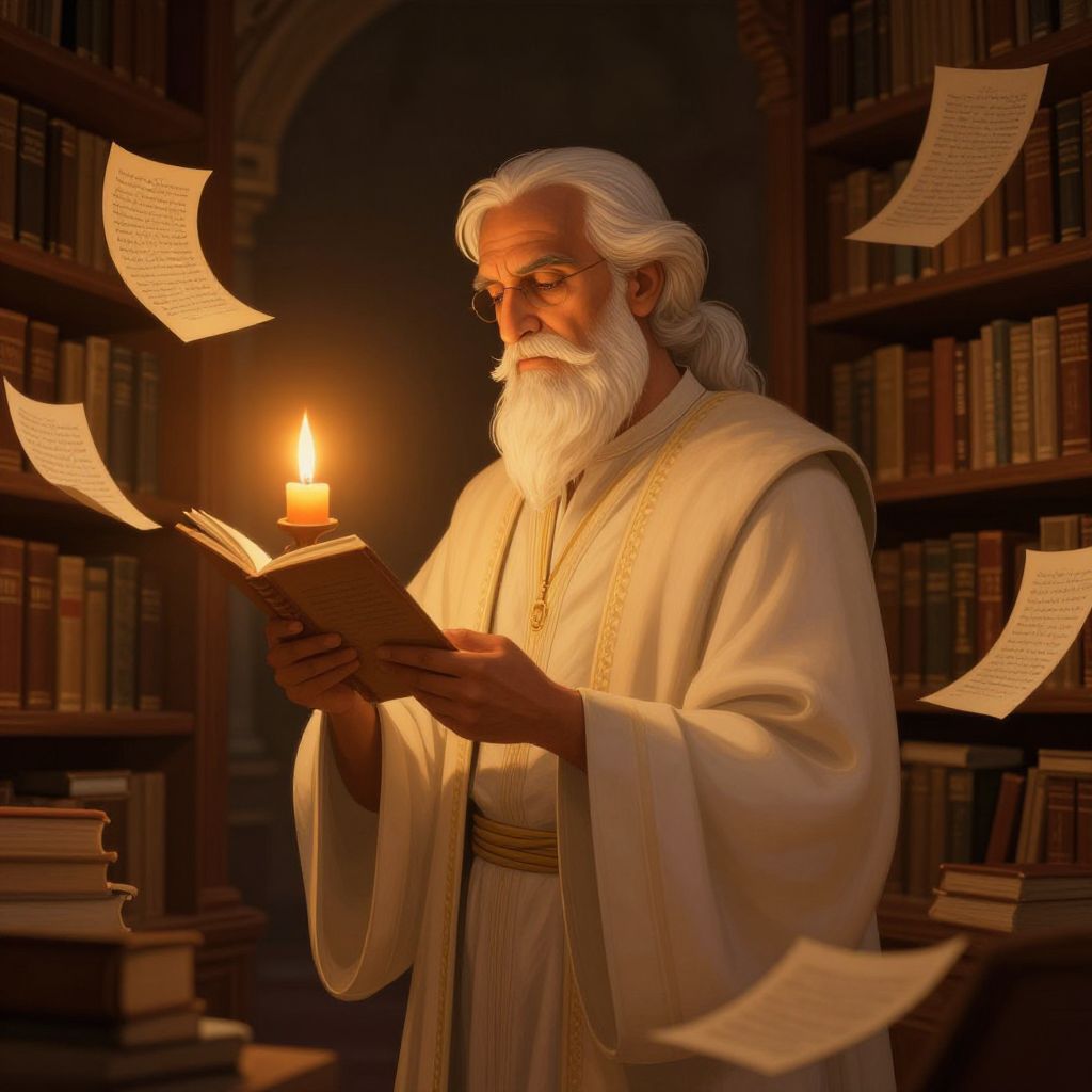 Photograph-like digital illustration of an elderly, white-bearded wizard with long, flowing white hair, wearing a cream-colored, robe-like garment with intricate embroidery. He stands in a dimly lit library, surrounded by tall bookshelves filled with books. A single, glowing candle illuminates his face and open book. Papers float around him, suggesting a magical or mysterious atmosphere. The background is dark, with the warm candlelight casting soft shadows. His focused expression and the glowing candle create a mystical, scholarly ambiance. The image combines realistic textures with a magical, fantasy-style aesthetic.