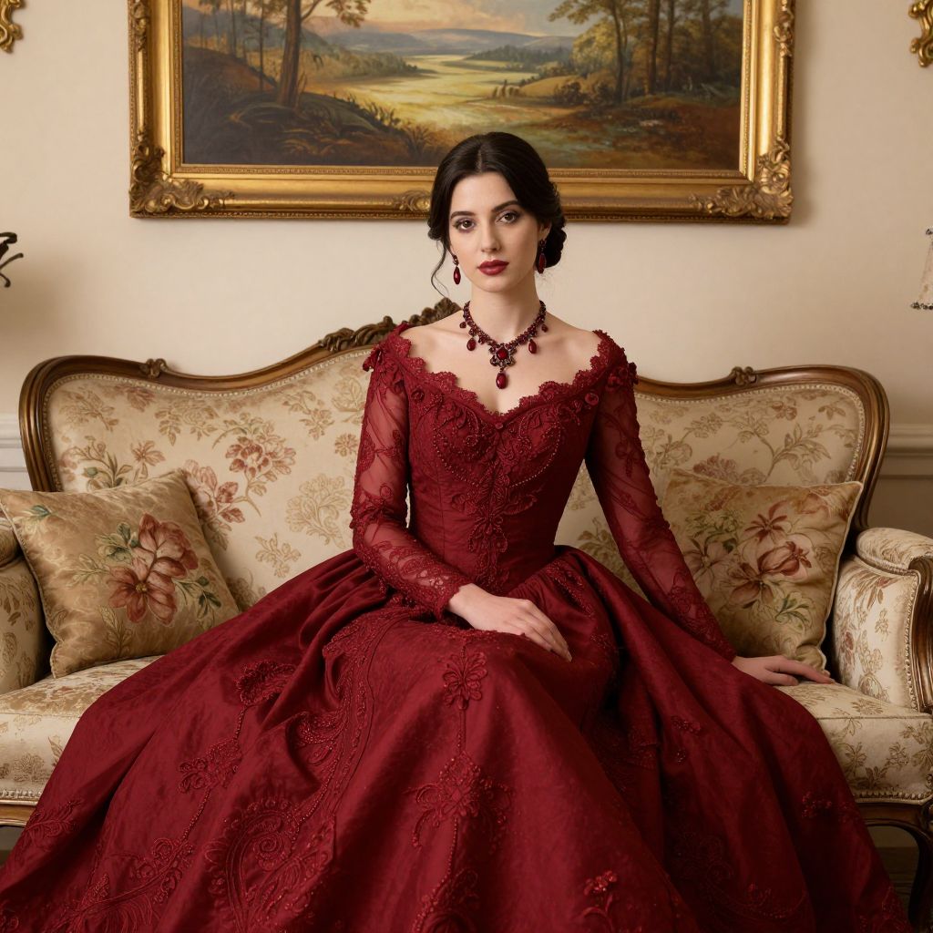 Elegantly seated in a vintage-style parlor, a woman dons a richly detailed crimson gown adorned with intricate lace and embroidery, complemented by a matching necklace and earrings, while surrounded by floral-patterned upholstery and framed artwork depicting a pastoral scene above her.