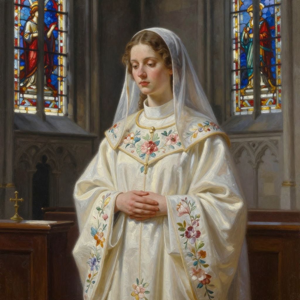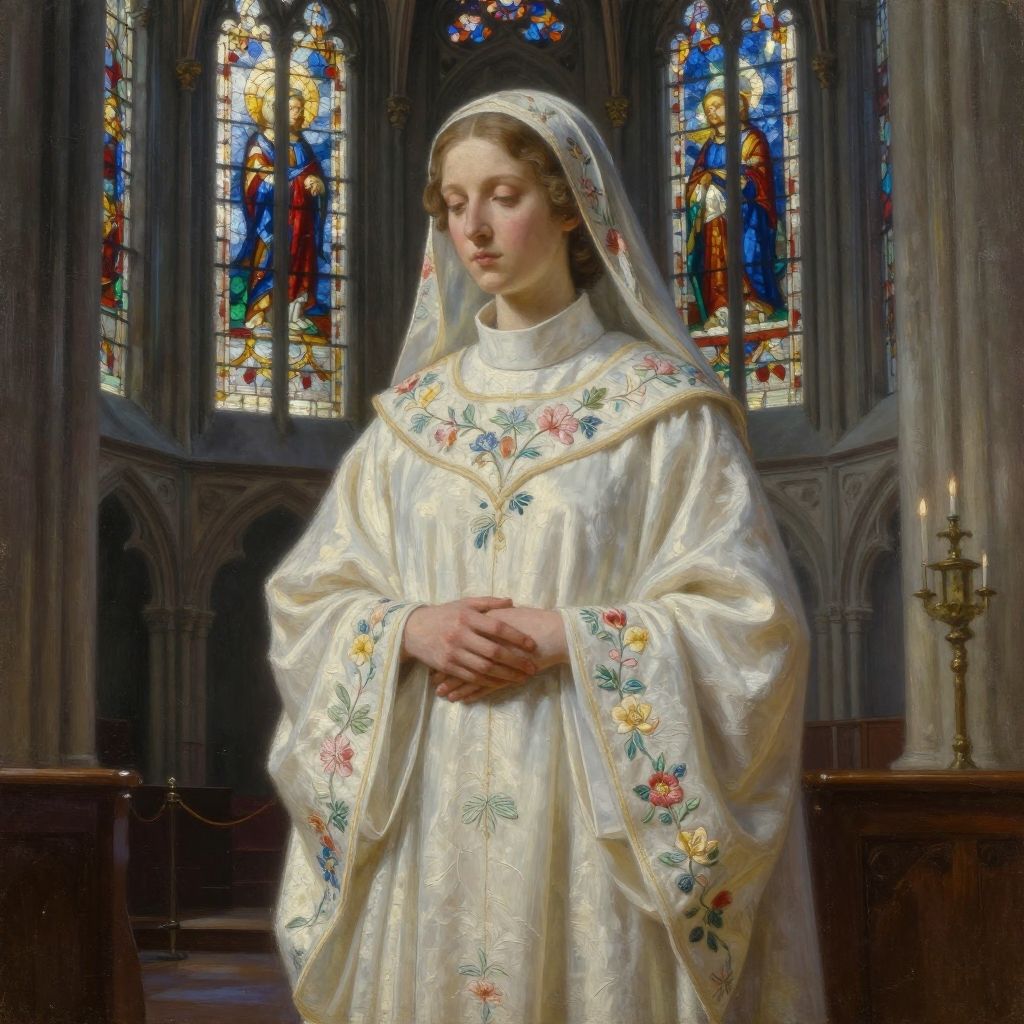 Priestess robes embroidered with delicate floral patterns, sunlight filtering through stained glass windows of a gothic cathedral, serene and reverent mood, oil painting realism