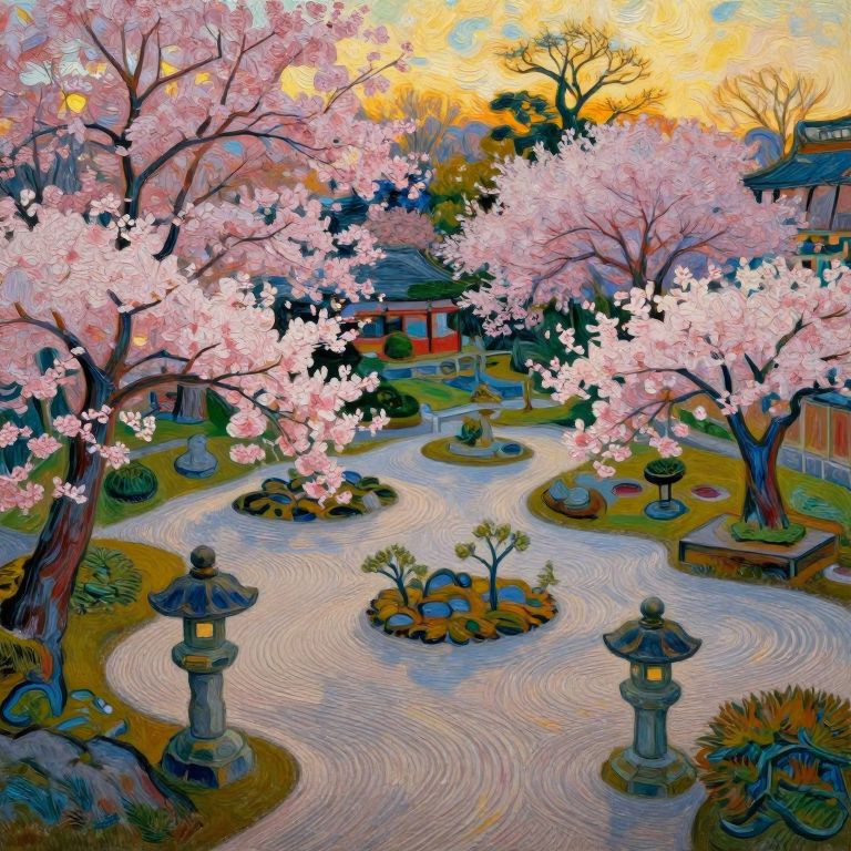 Imagine an idyllic Japanese garden scene where traditional elements harmonize with impressionistic techniques reminiscent of Monet's brushstrokes. In the center, a stately cherry blossom tree commands attention, its soft pink petals gracefully floating onto a serene pond below like delicate blossoms on a dreamy ocean. Captured from an aerial viewpoint, this unique perspective emphasizes the interplay between light, shadow, and color, creating an atmosphere of tranquility and enchantment that beckons viewers to lose themselves in the captivating fusion of nature, artistic expression, and whimsical inspiration.