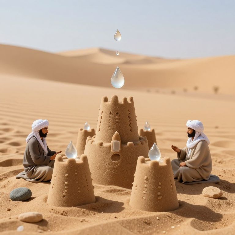 Photograph of two Middle Eastern men in white headscarves and gray robes, sitting in a sunlit desert, building elaborate sandcastles. The central sandcastle is tall with crenellations and small towers, each topped with a glowing, translucent water droplet. The men are on either side, one facing forward, the other to the right, both focused on their work. The sand is golden, with small rocks scattered around. The background features rolling sand dunes under a clear blue sky. The scene has a magical, surreal quality due to the glowing water droplets.