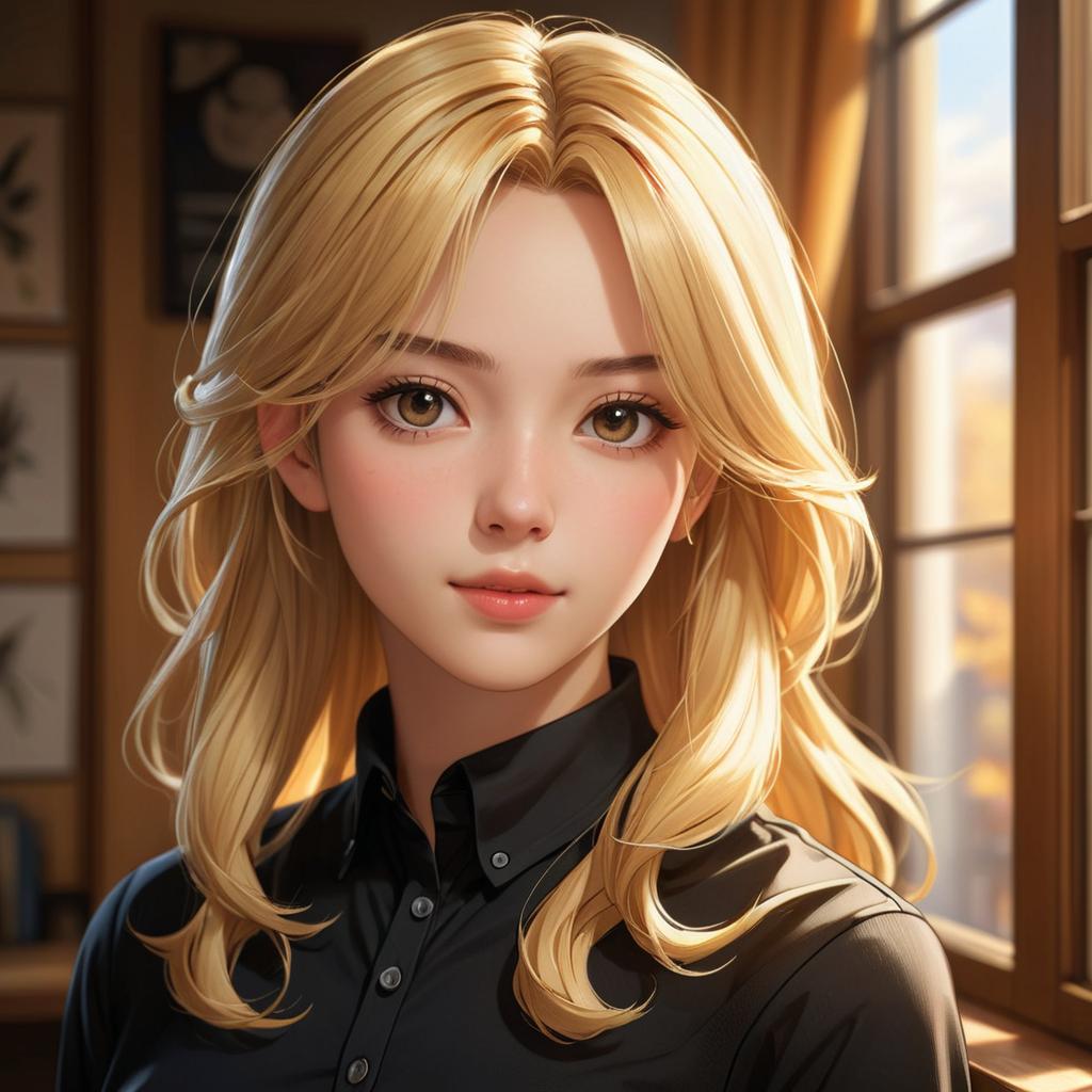 A realistic detailed anime style portrait of a blonde woman indoors, soft natural warm lighting from window, wearing a black fitted long sleeve shirt, realistic shading and shadows, smooth skin texture, intense eyes, detailed facial features, warm golden color tones