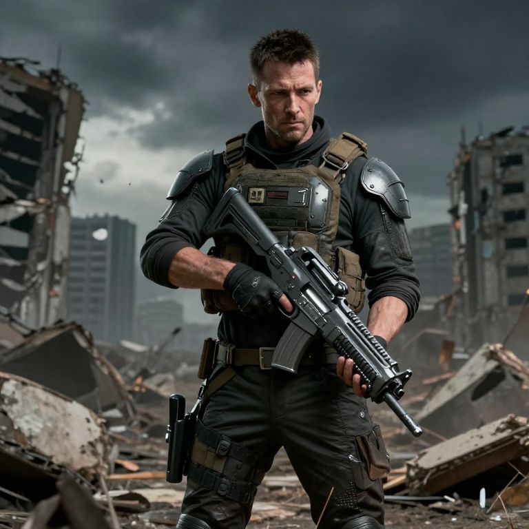 Kreator represented as a dystopian rebel leader in a post-apocalyptic wasteland, wearing tactical armor and custom gear, holding a futuristic weapon, background with destroyed city ruins and dark skies, gritty and dramatic storytelling visual.