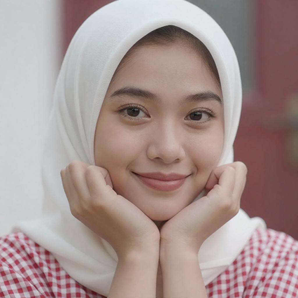 Asian woman with dark hair in a white headscarf, smiling with closed lips, resting chin on hands. Red and white checkered top, blurred red and white background. Close-up, soft lighting.