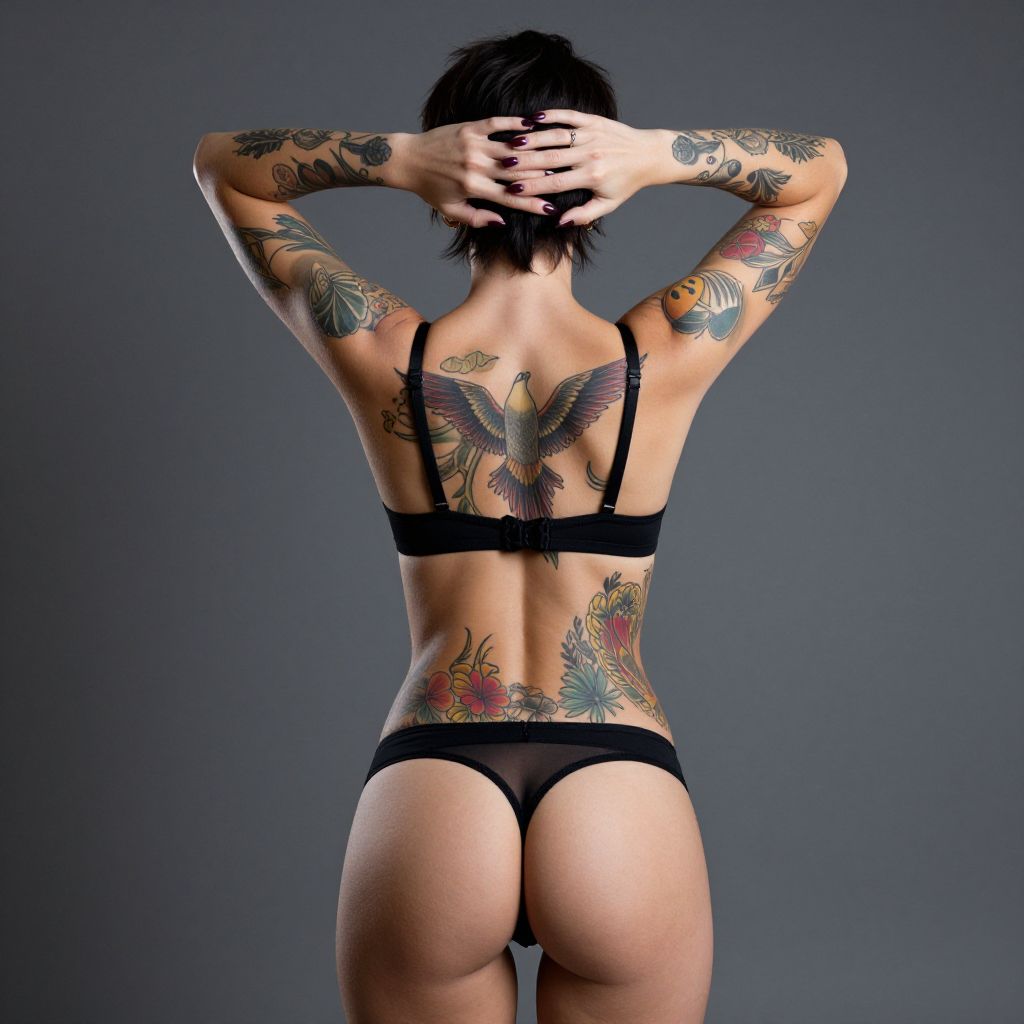 Photograph of a woman standing on a beach, facing away from the camera. She has dark hair in a messy bun and is wearing a black bikini with intricate, colorful floral tattoos covering her back, arms, and buttocks. The clear blue sky and calm ocean are in the background, with a few distant beachgoers visible. Her hands rest on her hips, showing off more tattoos on her arms.
