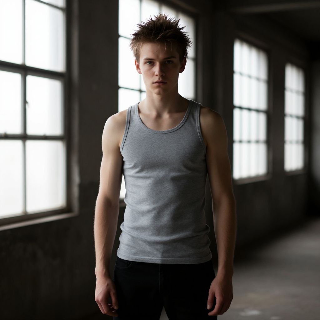 Photograph of a young, Caucasian man with spiky brown hair standing in a dimly lit, industrial-style room with large windows. He's wearing a fitted, gray tank top that highlights his toned arms and black pants. His expression is serious, and the natural light from the windows behind him creates a soft, shadowed effect around him. The room has a raw, unfinished look with concrete walls.