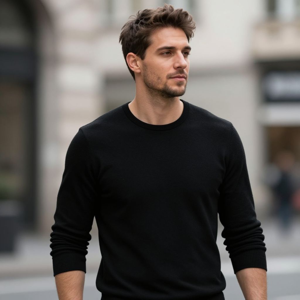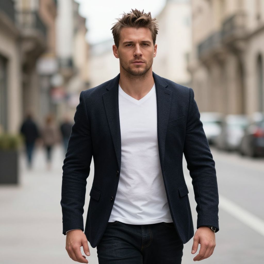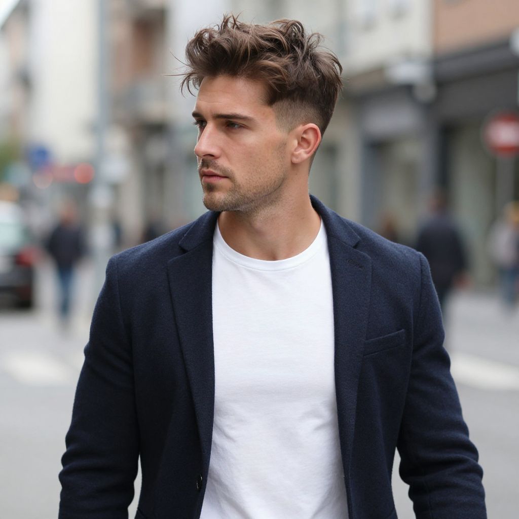 A fit European man with a Taper Fade haircut, casually posing in a trendy city street, capturing the essence of contemporary style with realistic details