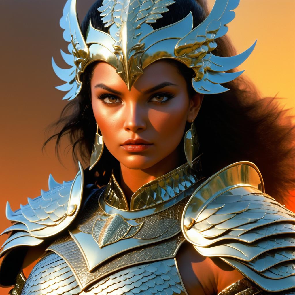 Portrait of a fierce warrior woman wearing battle armor made of dragon scales. Styled by Frank Frazetta, Boris Vallejo, Julie Bell with hyperrealistic, volumetric light, rendered in Octane.