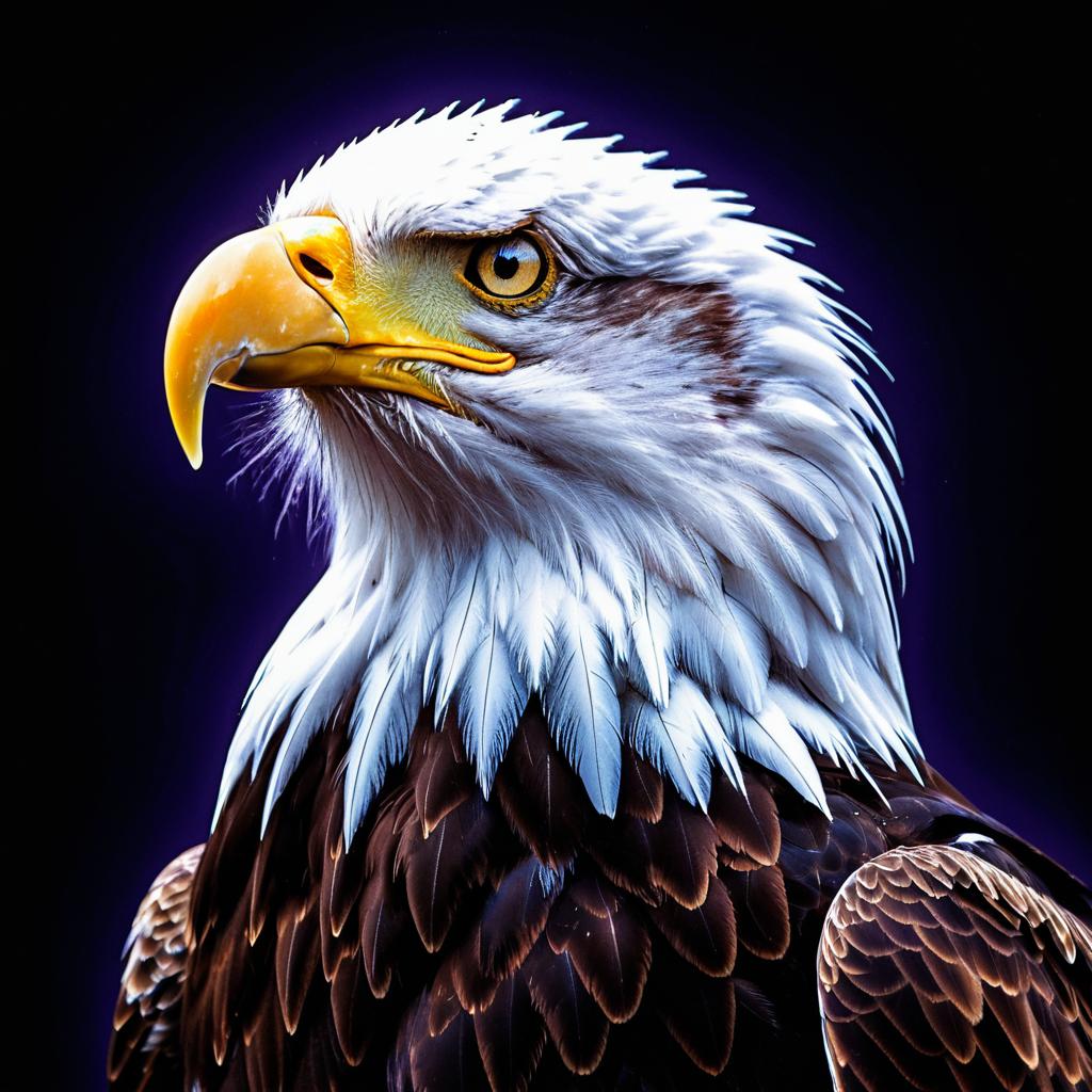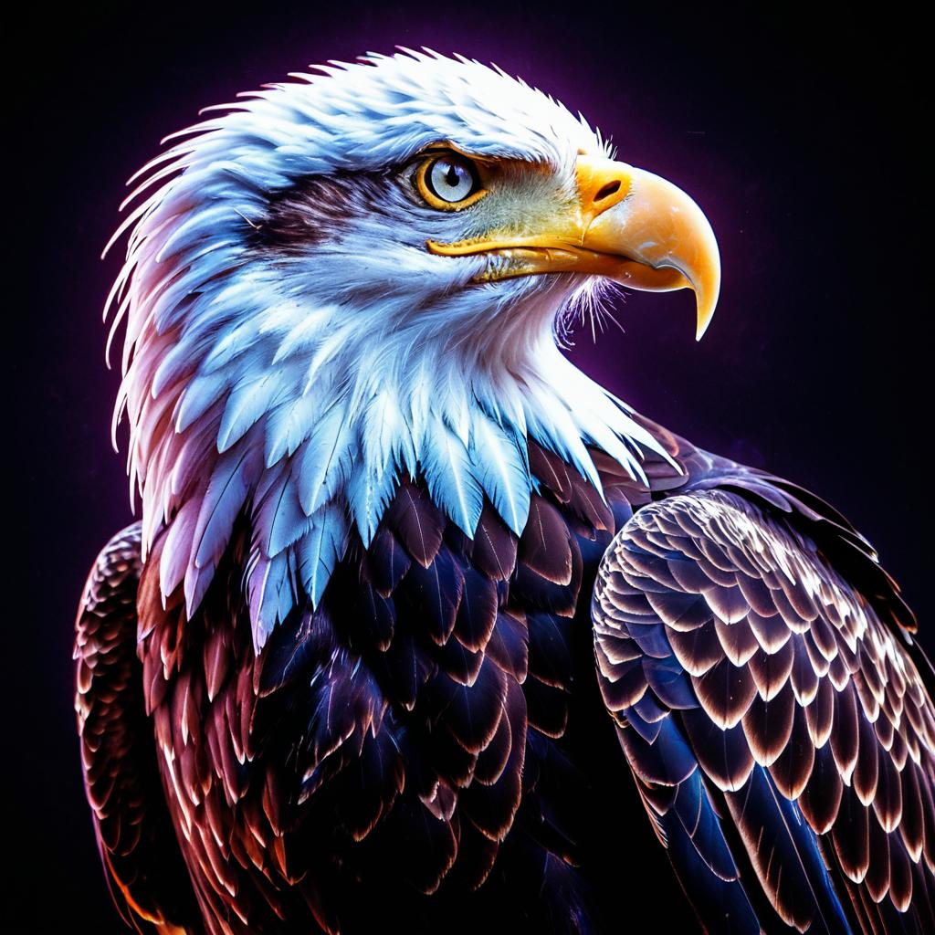 Radiant isotope, a bald eagle's essence distilled into its purest radioactive form, its glowing body a study in the beauty of atomic particles, ultraviolet neon blaze, vibrant electron spirals