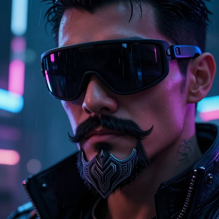 Moustache goatee on a futuristic cyberpunk character, neon city lights reflecting off their sharp facial hair, high-tech visor partially covering the face, intricate design elements in the goatee shape, dark urban environment with rain and glowing signs.