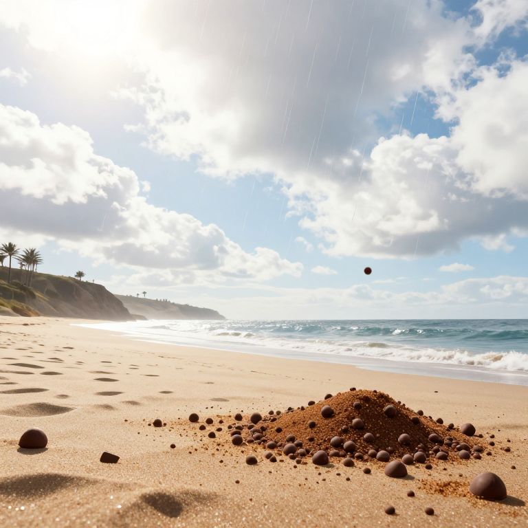 Vampires illustration, chocolate chip rain on bright sunny light, white clouds, brown sugar sand, california beach, panorama landscape, in the style of Moebius,