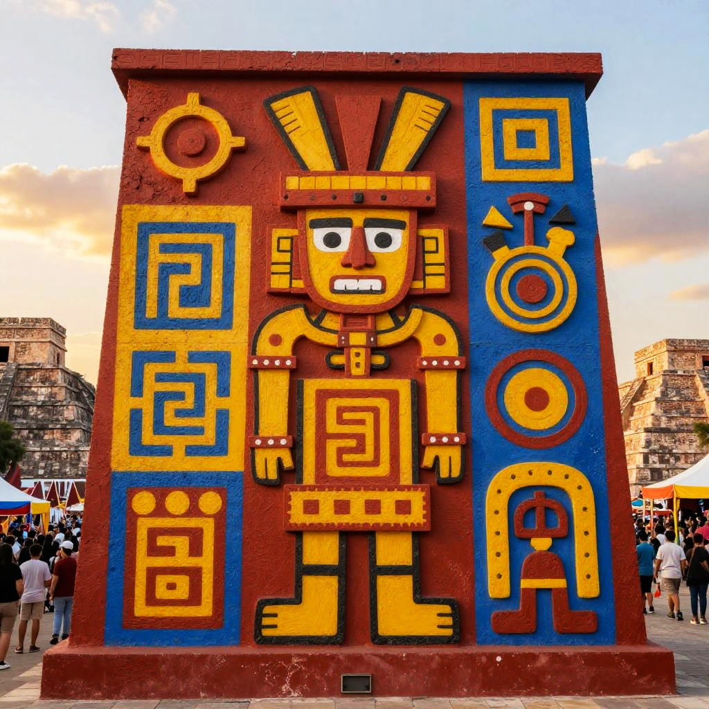 Vivid depiction of Aztec signs and symbols painted on a colorful mural, blending vibrant reds, yellows, and blues, showcasing geometric shapes and sacred iconography, set against a backdrop of ancient temples during a sunset festival scene.