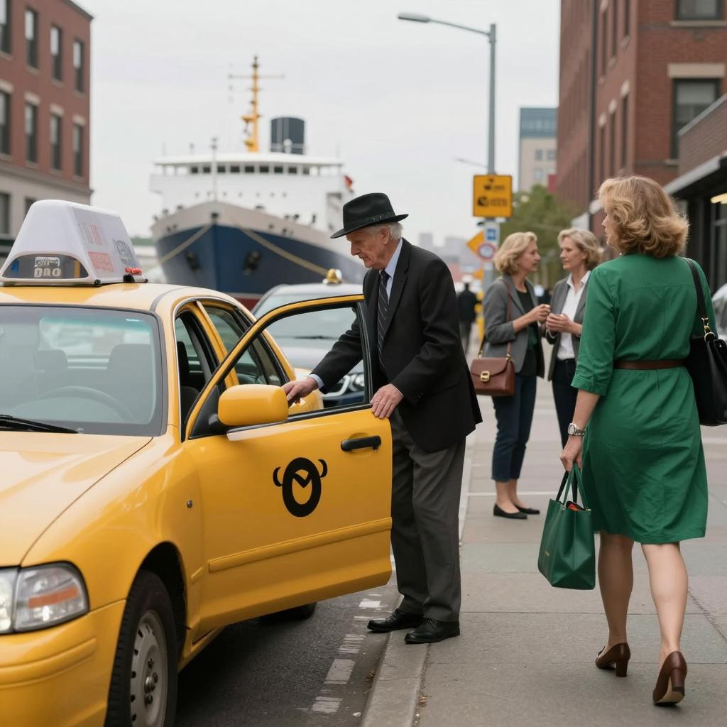 An elderly man dressed in a dark suit steps onto a green vintage tram marked with the number 293. He holds the door frame with one hand as he enters. The urban street scene includes pedestrians, traffic lights, and buildings in the background, all bathed in daylight. The tram has a nostalgic appearance with a slightly worn paint exterior.