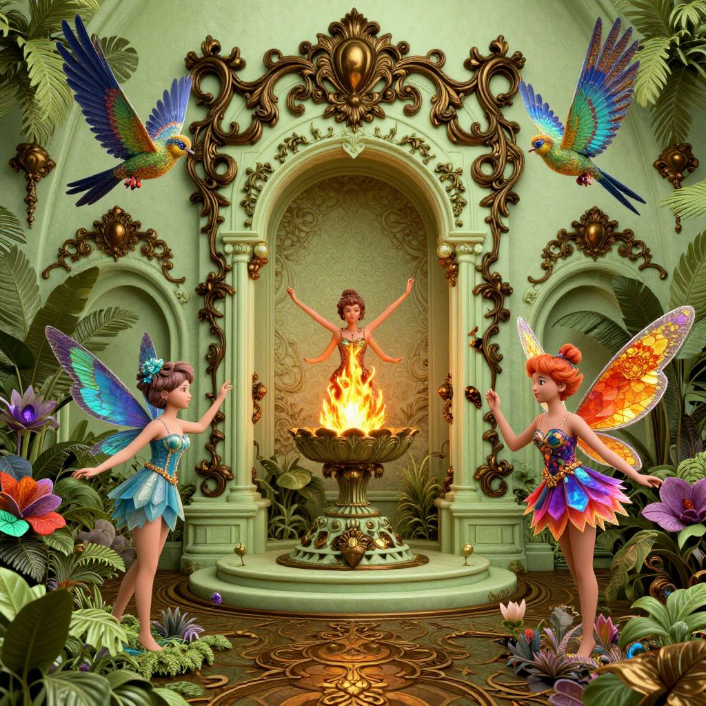 3D rendered image of two colorful fairies with vibrant mosaic-style wings and costumes standing in a lush tropical garden with detailed baroque architecture. In the center, a fiery figure resembling a fairy rises from an ornate flame pedestal. Surrounding the scene are vivid tropical birds and lush green foliage with intricate patterns on the floor and walls, reflecting a neo-mosaic, tropical baroque theme.