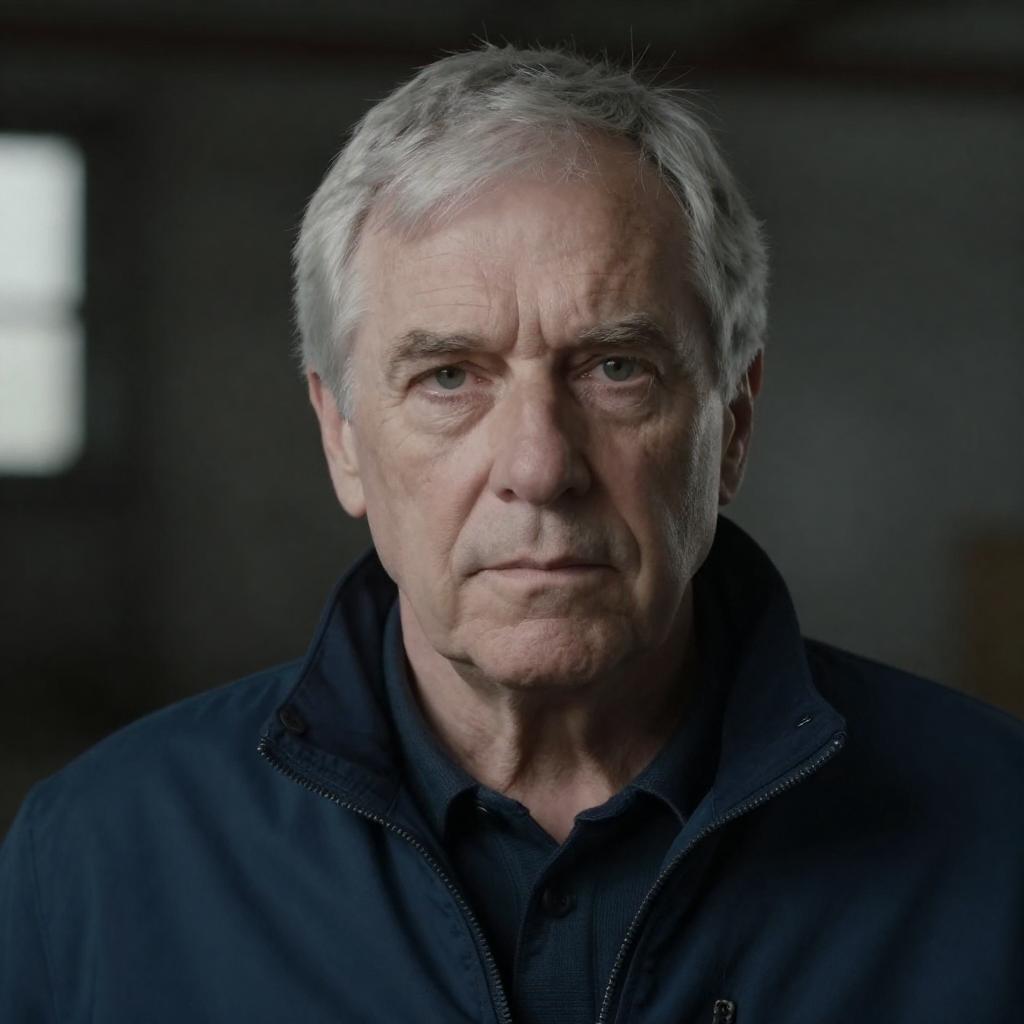 Photograph of an elderly white man with short gray hair and a mustache, wearing a black robe over a white ribbed shirt. He stands in a cluttered room with stacked boxes and shelves in the background, looking slightly to the side with a serious expression. The lighting is warm, highlighting his face.