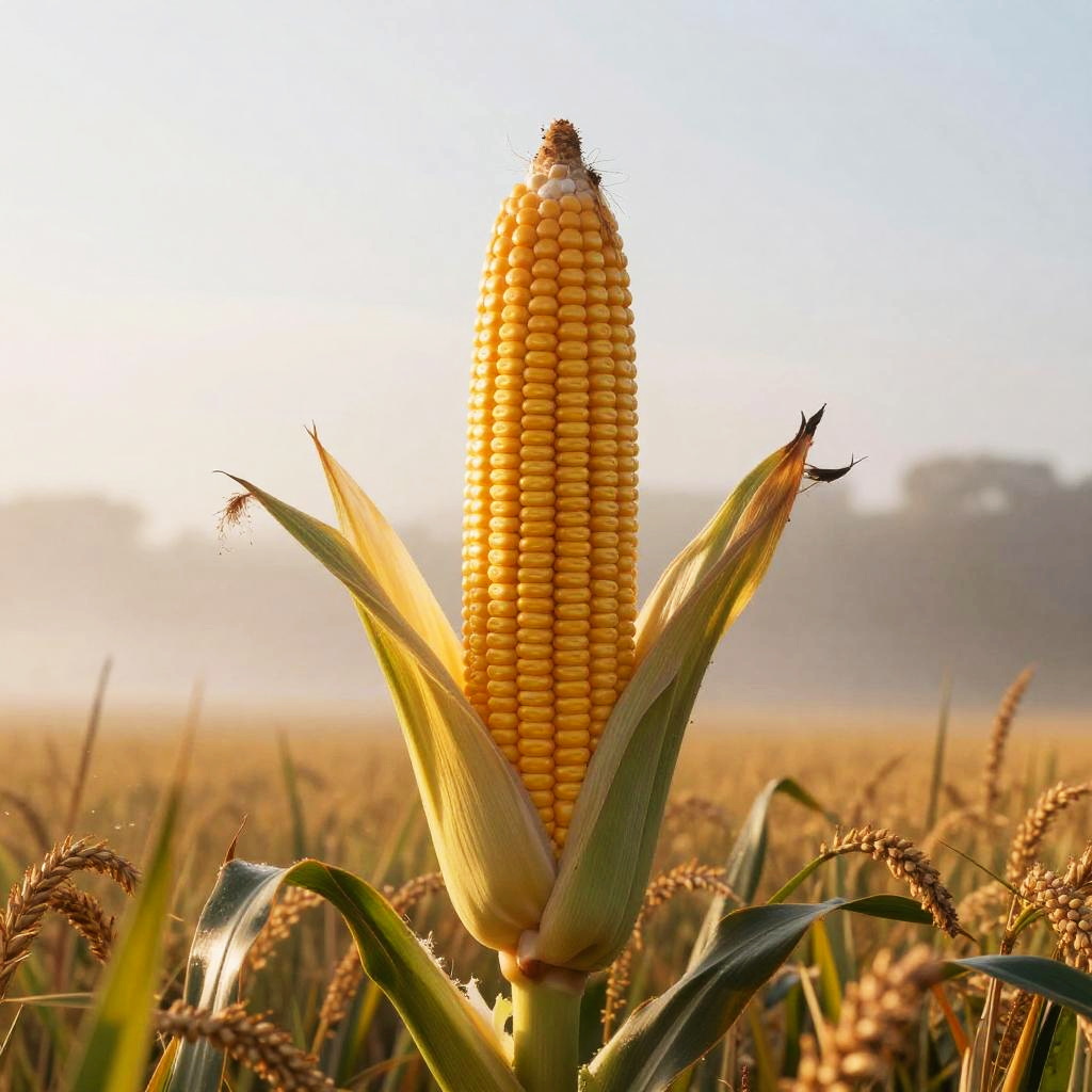 Mazorca, surreal image of a giant corn cob towering over a golden field, misty dawn atmosphere, soft glowing light filtering through leaves, dreamy landscape with hyper-realistic textures, blending fantasy and nature themes seamlessly.
