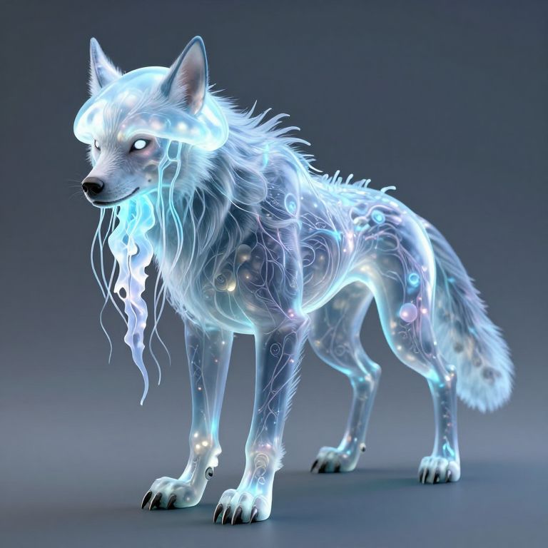 A detailed, bioluminescent, transparent werewolf with jellyfish skin, visible skull, and veins, designed by H.R. Giger.