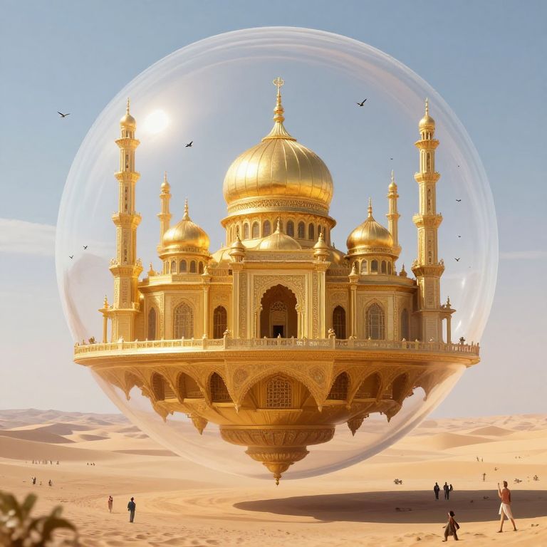 Digital illustration of a golden, dome-topped Islamic-style building with multiple minarets, floating in a desert, enclosed in a transparent bubble, with