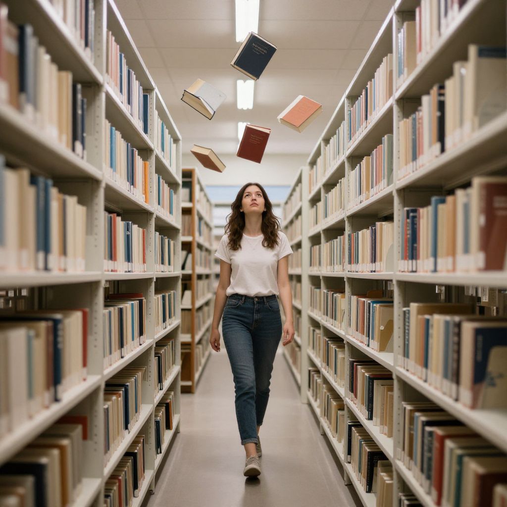 Woman walking through a library aisle as several books float above her head, defying gravity and creating a surreal scene amidst neatly organized shelves.