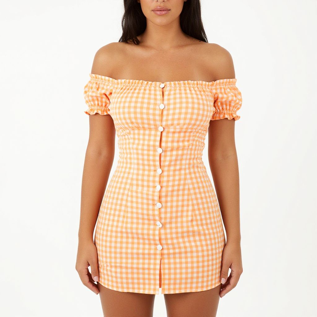 Photograph of a woman standing against a white background. She has long, straight black hair and is wearing an off-the-shoulder, orange and white gingham check dress with short, ruffled sleeves. The dress has a button-down front with white buttons and a fitted, slightly flared shape that reaches mid-thigh. Her arms are relaxed at her sides, and her face is partially visible, showing a neutral expression. The dress has a casual, summery style. The image is brightly lit, highlighting the dress's pattern and fabric texture.