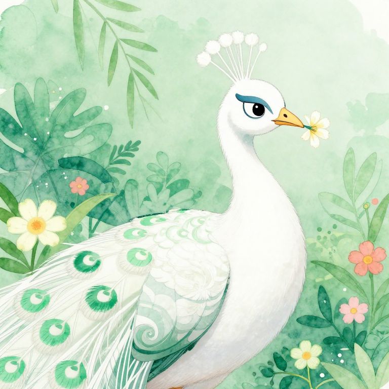 A cartoon white peacock with green spots and a flower in its beak, set against a watercolor background of green leaves and flowers.