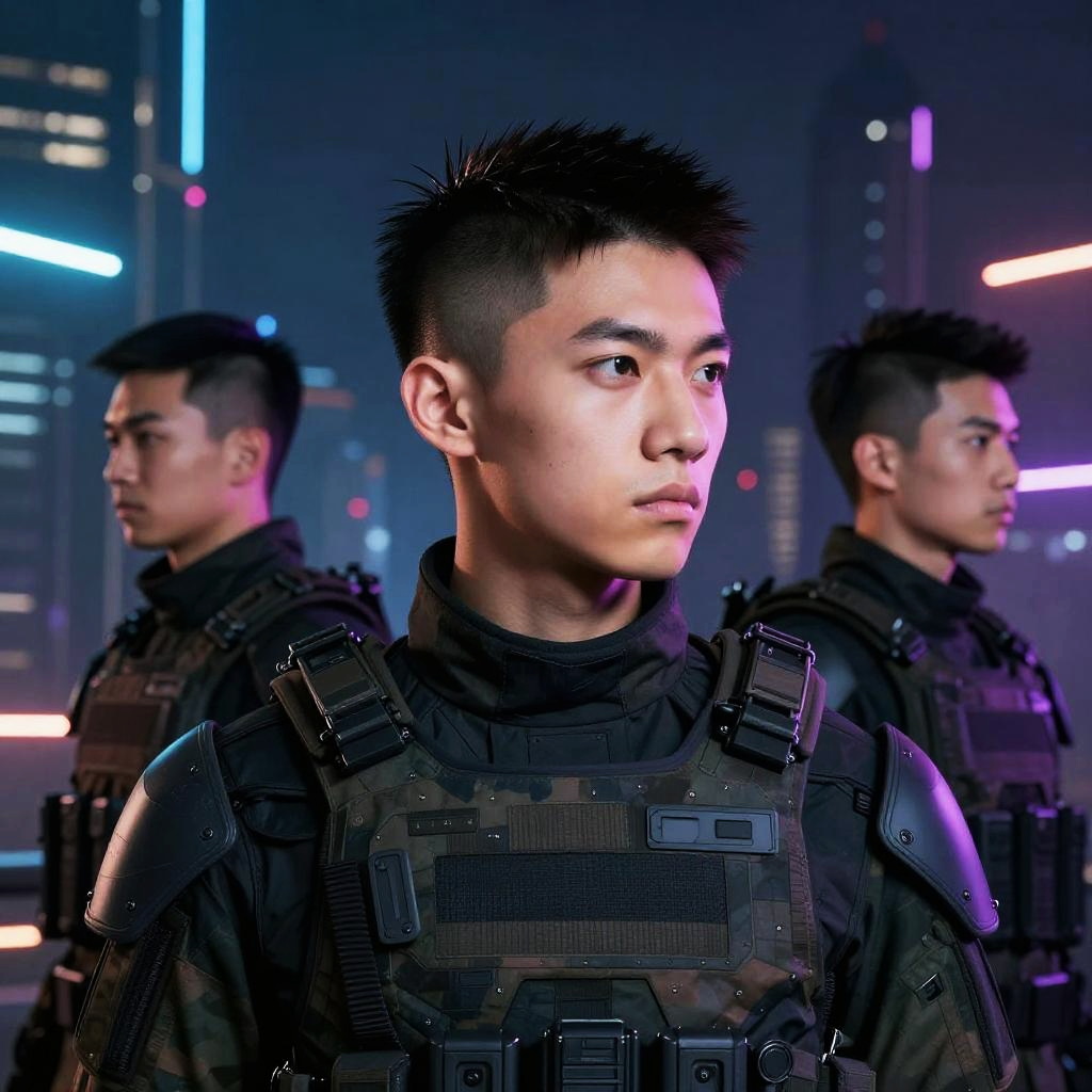 Military style haircuts on futuristic soldiers, cyberpunk theme with neon lights, sharp and edgy cuts, high-tech combat armor, night cityscape background