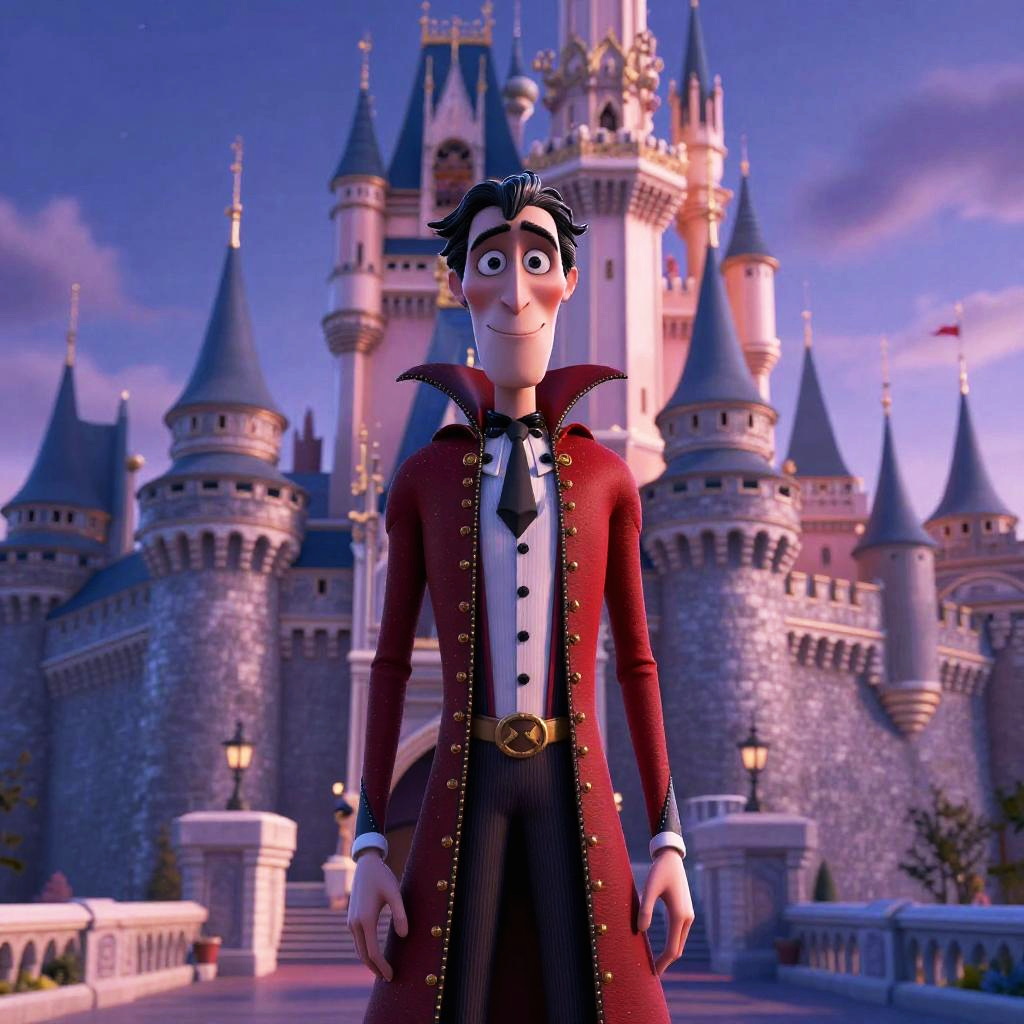 Digital art of a fair-skinned, black-haired witch in a black dress and hat, standing before a castle with blue sky.