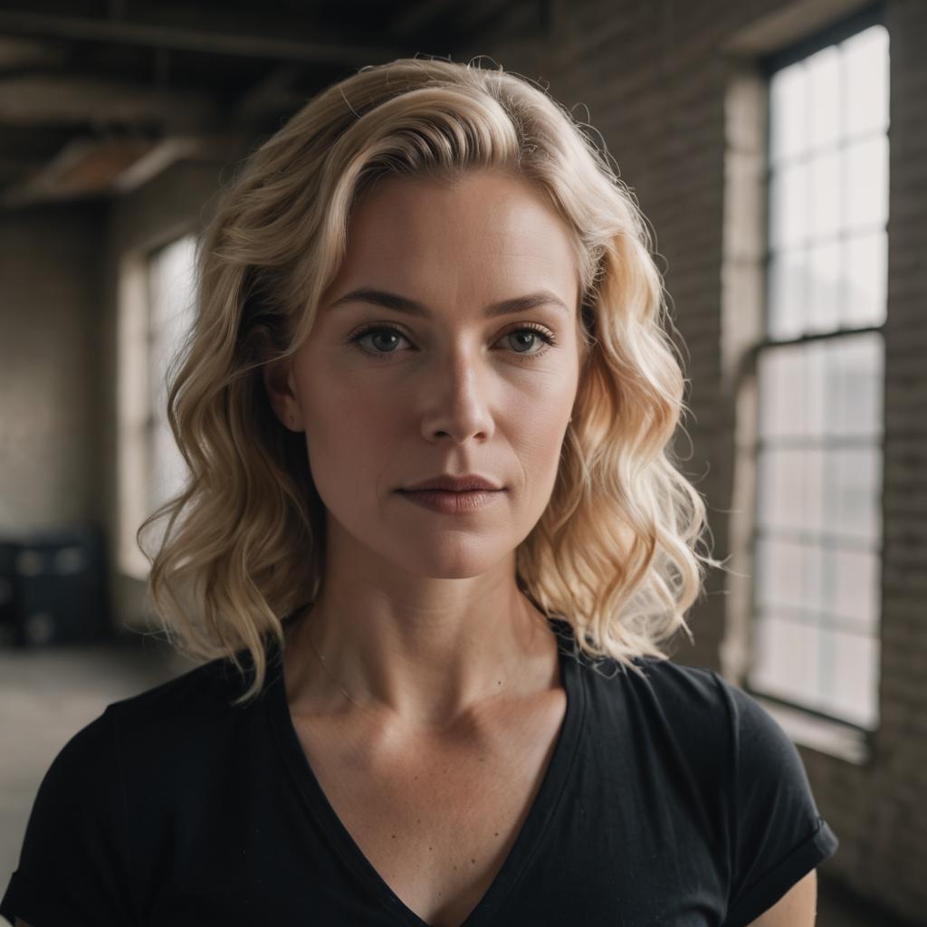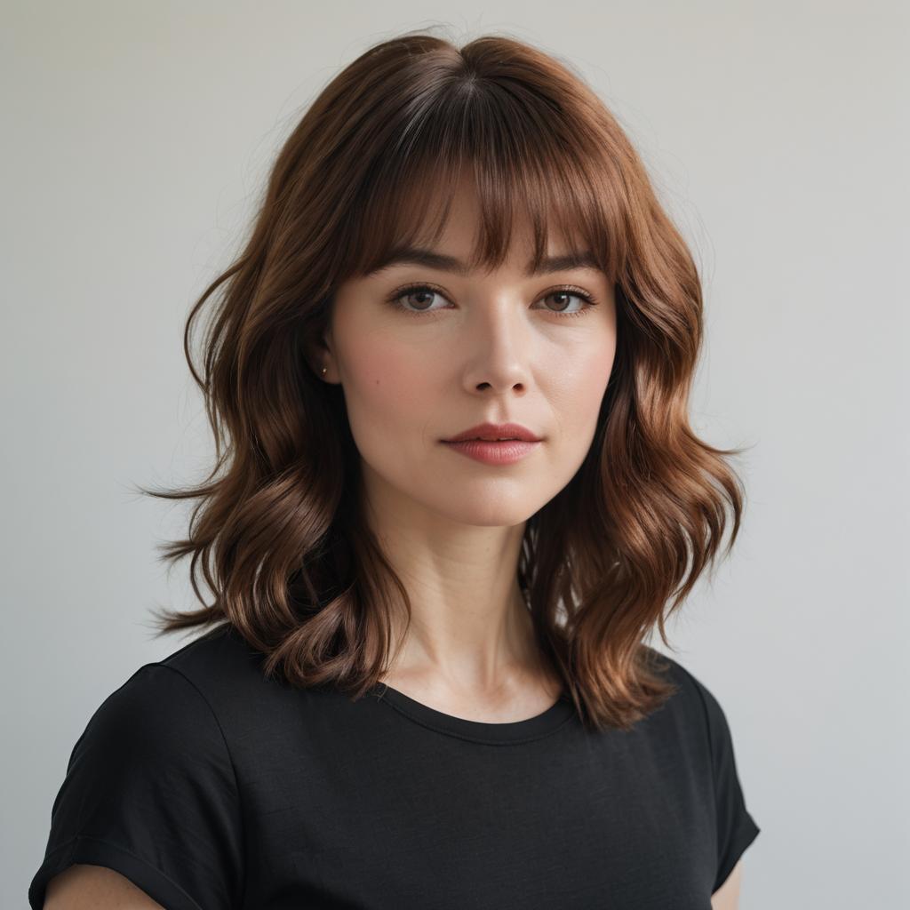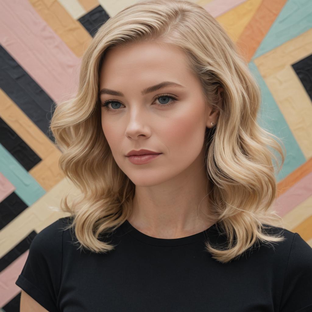 A chest-up intimate portrait, soft focus. The subject features voluminous layered blonde hair with caramel highlights and face-framing curtain bangs. A neutral, gentle expression is captured. The subject wears a simple fitted black t-shirt. The background is a lush, overgrown botanical garden at noon. Natural daylight lighting, depth of field, photorealistic, 8k, highly detailed hair texture.