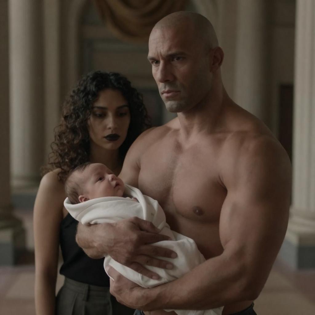 Photograph of a bald, muscular man with a serious expression, holding a swaddled baby in his arms. A woman with long curly hair and dark lipstick stands closely beside him, looking somber. They are in a dimly lit, grand hall with tall columns and draped curtains in the background.