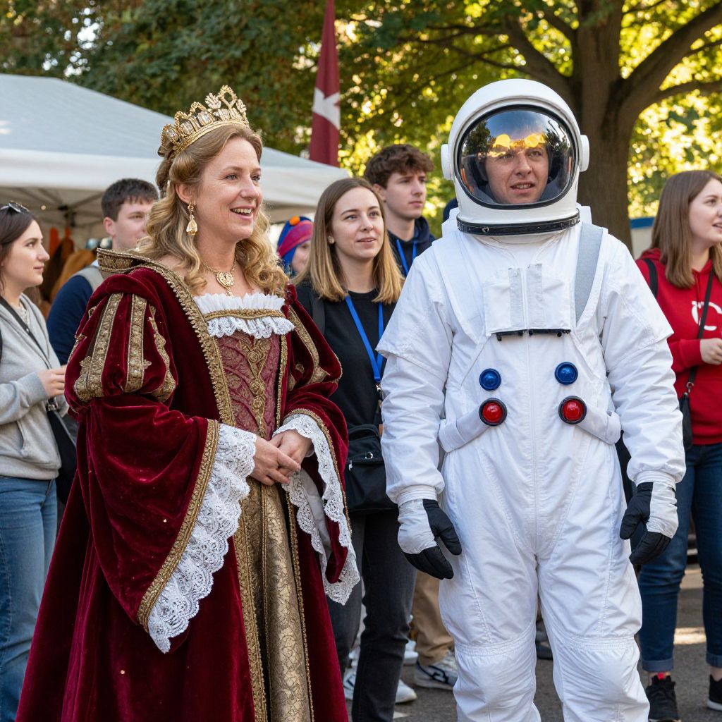 A cheerful group of volunteers in a local fair setting, dressed in colorful and imaginative fancy dress costumes as part of a community celebration, one wearing a royal court outfit with a flowing red gown and elaborate lace, another in a space-themed astronaut suit with a helmet and bright helmet visor, soft sunlight through trees, natural skin tones, expressive faces, lifelike and vivid details