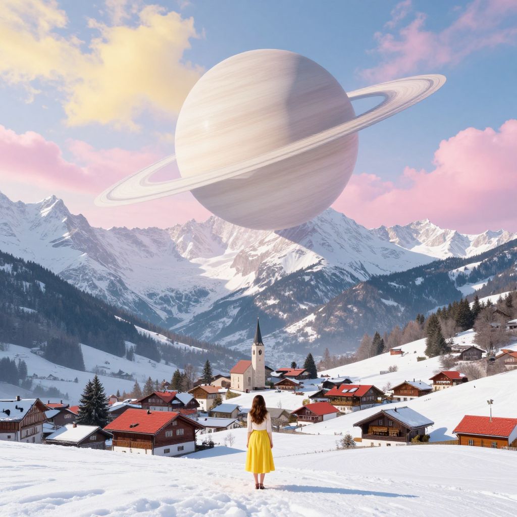 A young woman in rustic attire gracefully juggles a mesmerizing array of celestial spheres—planets and moons suspended mid-air in perfect harmony, defying gravity in a serene forest setting.