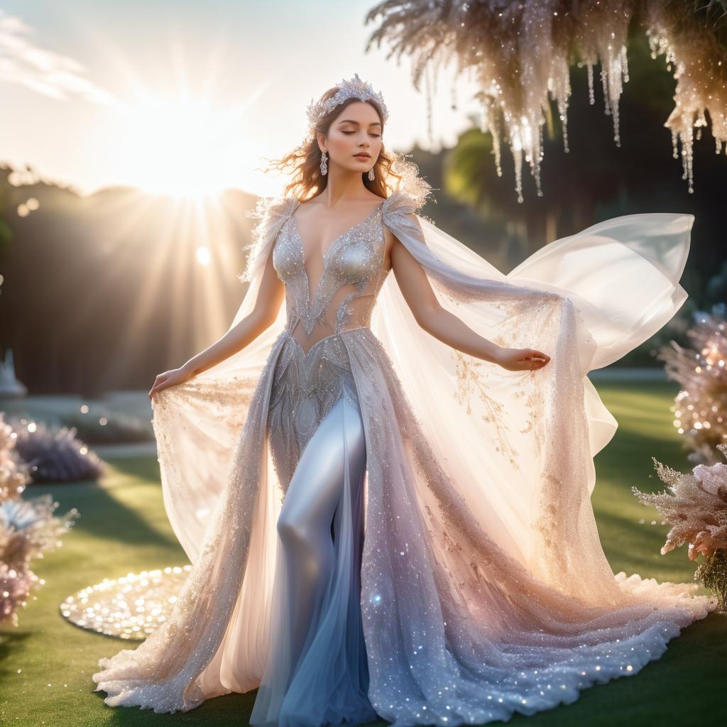Photo-realistic image of a celestial goddess standing in an elegant outdoor park landscape. She wears a shimmering, silk floral-inspired gown with intricate beadwork and a high slit, surrounded by glowing crystalline flower motifs. Soft, high-key lighting enhances the ethereal atmosphere, highlighting her wavy blonde hair and delicate accessories. Captured with cinematic detail, reminiscent of a Canon EOS R5 and RF 85mm f/1.2L lens in 8K resolution.