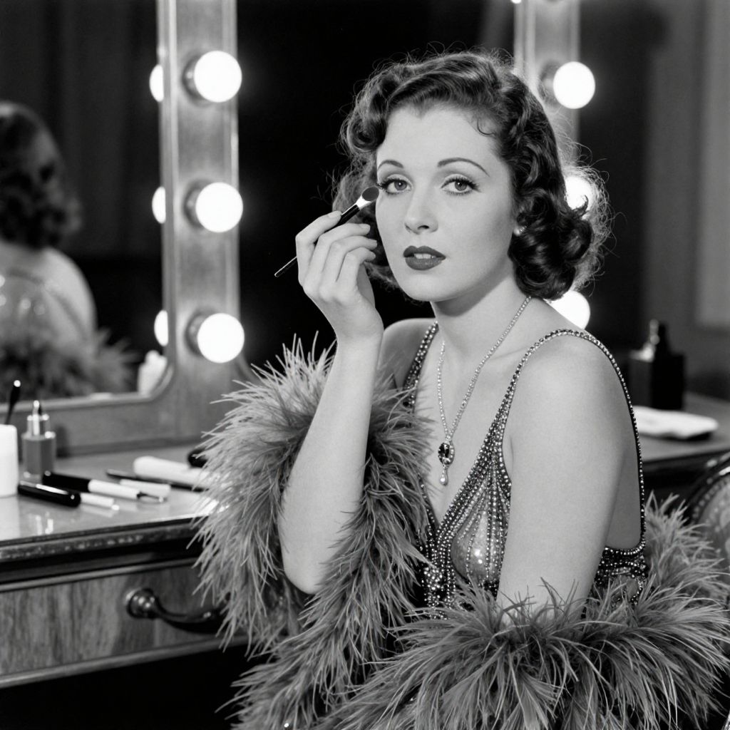 A vintage black-and-white illustration depicts a glamorous woman adorned in a beaded gown and feather boa, meticulously applying makeup in a luxurious dressing room setting, evoking the classic elegance of 1930s cinema.
