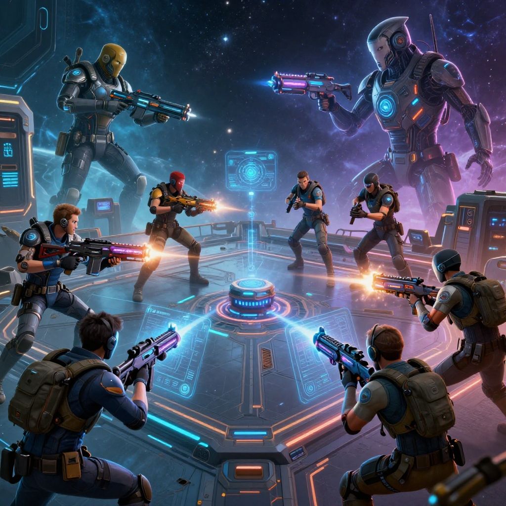Cs games usc digital battlefield with futuristic avatars, cosmic background, glowing weapons, holographic interfaces, fast-paced strategy and teamwork, high detail sci-fi illustration