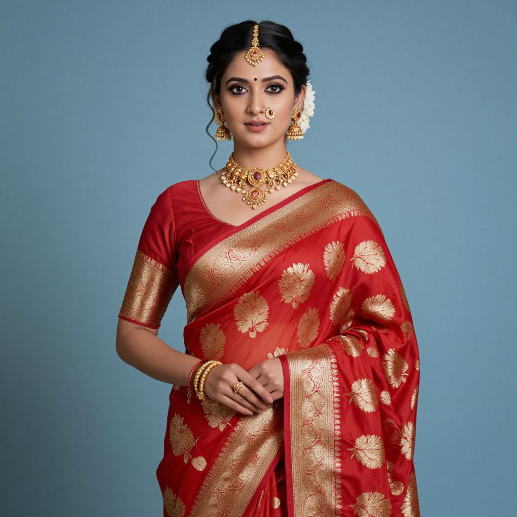 Indian woman in red silk saree with gold floral patterns, wearing gold jewelry, against a blue background. Photograph. Elegant, traditional attire.
