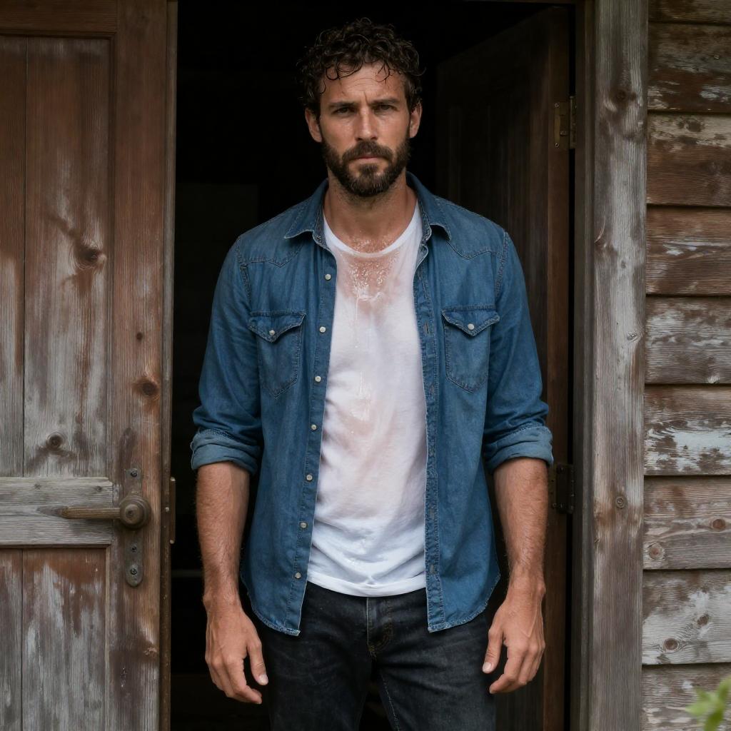 Photograph of a muscular, bearded man with wet, disheveled blonde hair wearing a gray tank top. He stands in a dimly lit, outdoor setting with a blurred, bright light source in the background. His expression is serious and contemplative. The background includes indistinct, dark shapes and a reflective surface.