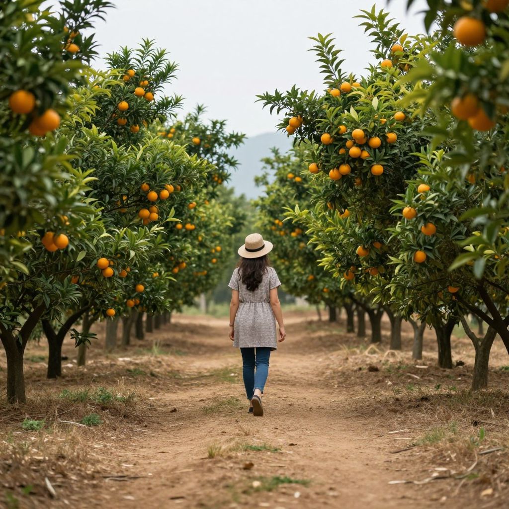 A woman walks down a serene dirt path flanked by rows of orange-laden trees, their vibrant fruits hanging low amidst lush green foliage, creating a tranquil and immersive orchard scene.