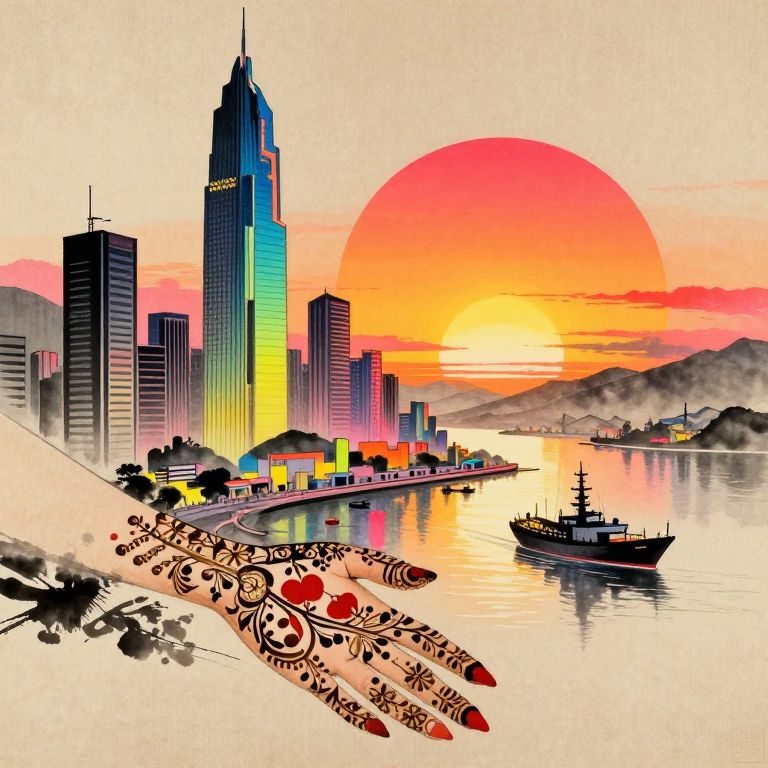 This is a vibrant, digital illustration of a cityscape at sunset. The tall, blue-and-yellow gradient skyscraper dominates the center, surrounded by other dark buildings. The bright orange and pink sun sets behind the city, casting a warm glow over the reflective water. In the foreground, intricate black and red tribal patterns are overlayed on the bottom left, with a traditional wooden ship floating on the right. Mountains are visible in the background, adding depth to the scene. The overall style is colorful and modern, with a mix of urban and natural elements.