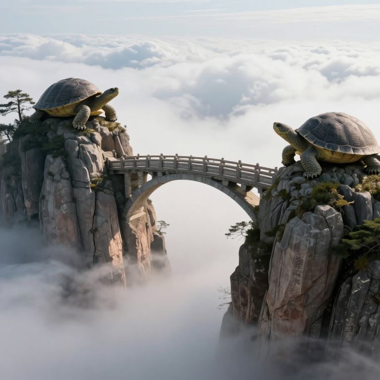 This is a digitally created fantasy image featuring two large, turtle-like creatures with dark, textured shells perched on rocky cliffs. Between them, a wooden arch bridge stretches across a misty gap. The cliffs are jagged and gray, partially covered with sparse greenery. The background shows a bright, partly cloudy sky. The turtles' positions are symmetrical on either side of the bridge, which is centered and elevated. The image has a surreal, whimsical style, blending elements of nature and fantasy. The mist adds a mystical, ethereal quality to the scene.