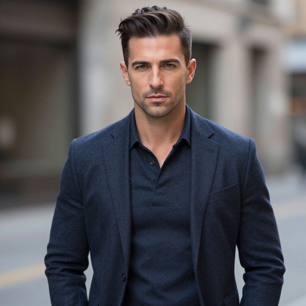 Photograph of a handsome, young Caucasian man with short, styled dark brown hair and a light stubble. He has a serious expression and piercing blue eyes. He is wearing a dark navy, textured blazer over a black, button-up shirt. The background is blurred, showing an urban street with indistinct buildings and a faintly visible road. The image has a sharp focus on the man, highlighting his clean, stylish appearance in contrast to the soft, muted background. The lighting is natural, emphasizing his strong jawline and the texture of his blazer.