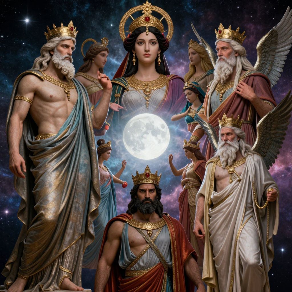 Digital artwork of ancient gods and goddesses with crowns, togas, and wings, surrounding a glowing full moon in a starry sky.