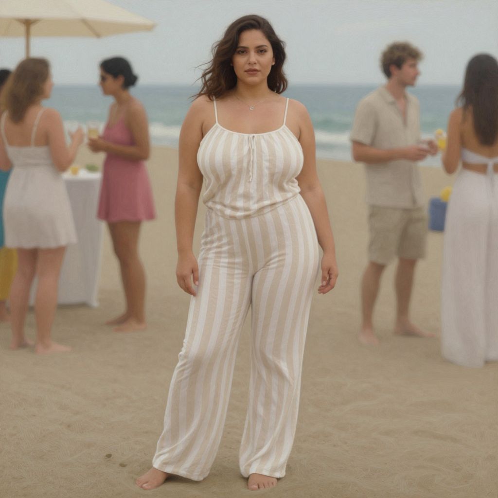 Photograph of a curvy, dark-haired woman with medium skin tone standing on a sandy beach. She wears a white, sleeveless, high-waisted jumpsuit with thin vertical stripes, barefoot. Her expression is neutral. In the background, four people are blurred, dressed in casual summer attire; a woman in a pink dress, a man in a beige shirt and shorts, and two others in white dresses. The ocean and a yellow umbrella are visible in the distance. The overall scene suggests a relaxed, social beach gathering.
