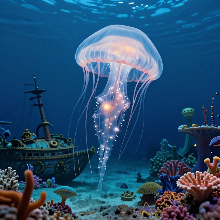 Envision an alluring underwater realm reminiscent of Dalí's surrealistic visions, viewed through the translucent membrane of a regal jellyfish drifting in the profound azure ocean. The captivating creature emits luminous lights that perform a hypnotic ballet in harmony with its rhythmic pulsations, generating an ethereal ambiance. In this dreamlike seascape, spectral relics of antique vessels and thriving coral reefs adorned with vivid aquatic life intertwine with Dalí-inspired landscapes, sparking awe and intrigue as the observer is drawn further into this captivating underwater fantasy.