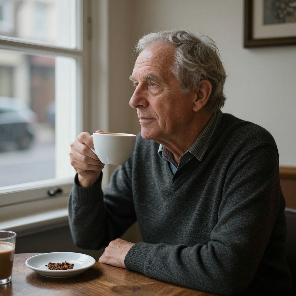 In a quiet moment of introspection, a senior man sips coffee by the window, his gaze drifting outward as the soft hum of life outside blends with the warmth of memories within, evoking a profound sense of contemplation and the gentle passage of time.