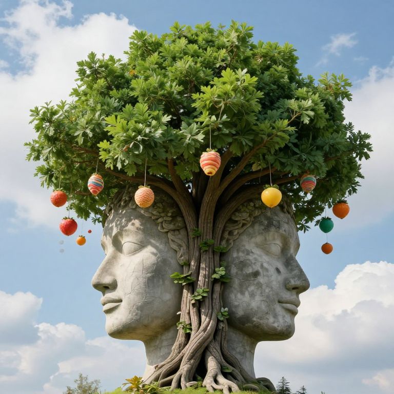 Two serene stone faces merge seamlessly with a lush, inverted tree, its branches sprouting skyward into fluffy clouds while cascading candy-colored fruits dangle like magical ornaments.