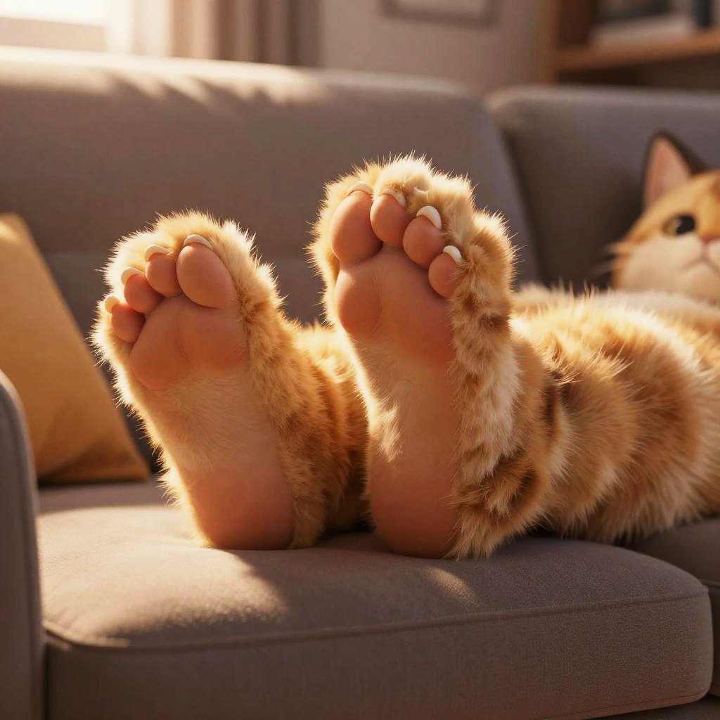 Furries feet resting on a cozy couch, soft fur, relaxed pose, indoor lighting, warm atmosphere, detailed textures on paws and claws, stylized character art