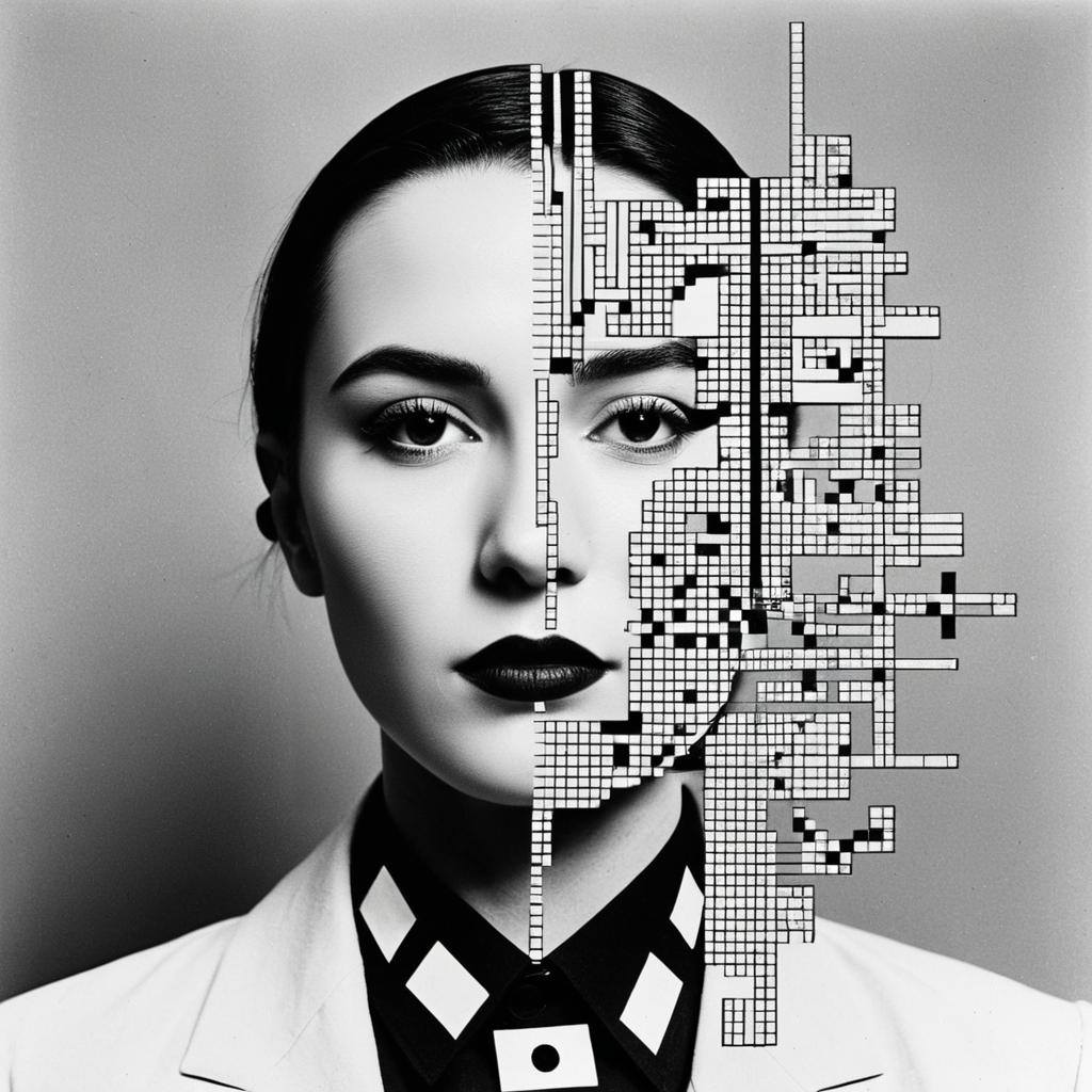 Black and white portrait of a non-binary person with geometric constructivist lines and shapes overlaying the face and background. The subject has sharp facial features, dark lipstick, slicked-back hair, and wears a white collared shirt with a dark blazer. The image combines themes of technology, futurism, and avant-garde art inspired by constructivist artists with geometric data block elements.